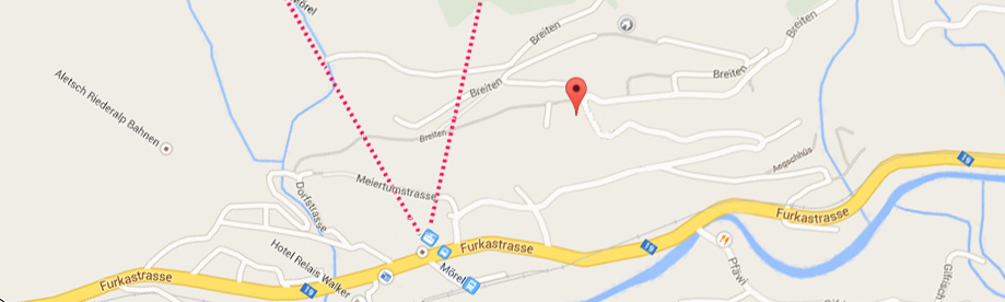 Arrivée en voitureSi vous arriver de Bern par Spiez vers Kandersteg et par le tunnel du Lötschberg (Tunnel ferroviaire de transports auto) pour Viège et Brig. De l'Italie, vous arriverez en Suisse par le col du Simplon ou le tunnel du Simplon (Tunnel ferroviaire de transports auto) par Brig. De Lausanne, vous arriverez à Brig par Sion et Viège. De la ville frontière suisse de Brig, vous irez en direction de la Furka et arriverez en 7 km à Mörel. Attention: Restez sur la route principale dans la vallée, NE tournez PAS à Bitsch en direction de Ried-Mörel!. Du Tessin, vous pourrez passer par le col du Nufenen puis Ulrichen en été. L'hiver, nous vous conseillons de passer par l'Italie, par le tunnel du Gotthard ou le tunnel ferroviaire de transports auto jusqu'à Oberwald. De Lucerne, vous prendrez la route du Gotthard par Göschenen et Andermatt pour Realp. De là, un train (transports auto) vous amènera à Oberwald. En été, vous aurez la possibilité d'emprunter le col de la Furka. Depuis Oberwald ou Ulrichen, vous continuerez la route en direction de Brig. Au centre du village de Mörel, avant la gare du téléphérique, vous prendrez la route à droite en direction deBetten, Goppisberg et Breiten. Après environ 1km vous verrez le panneau 'Breiten'. |